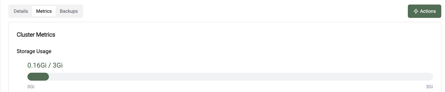 The VectorChord Cloud provides several graphs for monitoring system and database metrics. You can access the Metrics dashboard from the cluster details in the VectorChord Cloud Console. Observable metrics include: